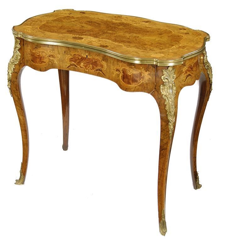 A late 19th century walnut and marquetry serpentine occasional table, the quarter veneered burr walnut central panel with a floral spray outer border and a moulded gilt brass edge to a divided frieze drawer on gilt brass mounted cabriole legs, 29in (73.5cm) h, 31.25in (79.2cm) w, 18in (45.5cm) d.