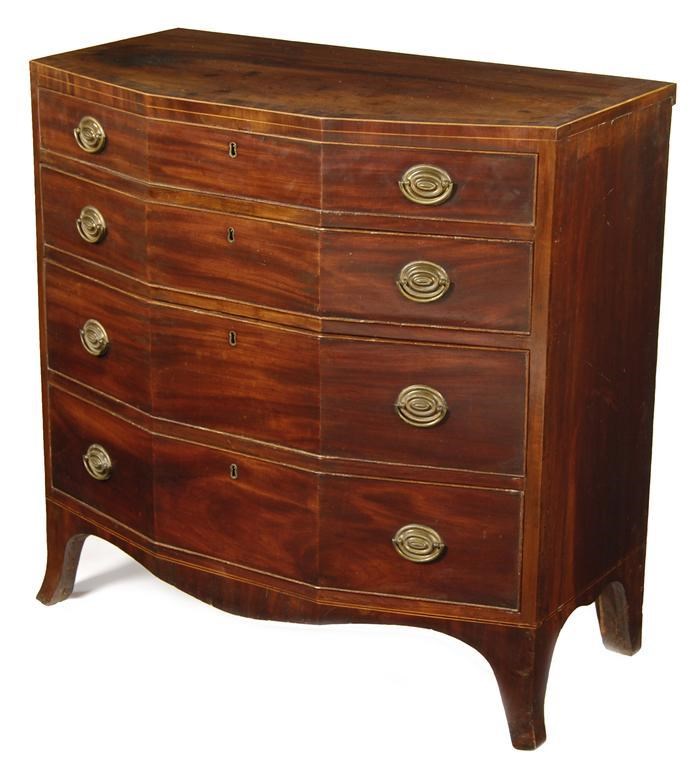 A late George III mahogany canted front chest, inlaid stringing, the banded top above four long graduated oak lined drawers, fitted oval brass plate handles, on swept bracket feet, 36in (91.2cm) h, 37.25in (94.6cm) w, 19.25in (49cm) d. Some restoration. Provenance: Norman Adams.