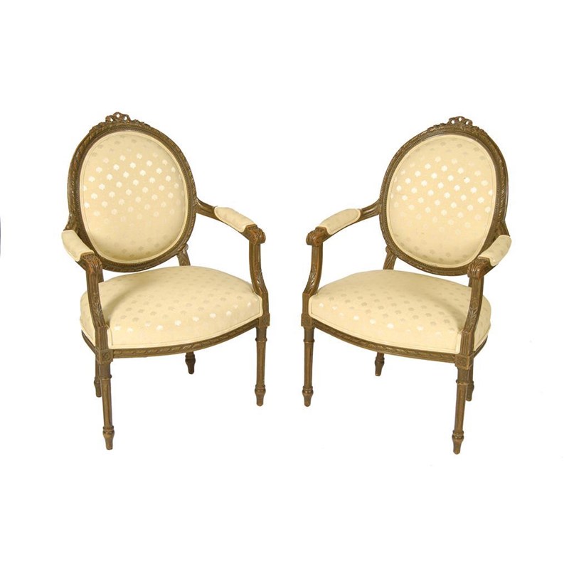 A pair of French carved and painted wood fauteuil, with oval backs padded arms and bowfront seats, early 20th century. (2)