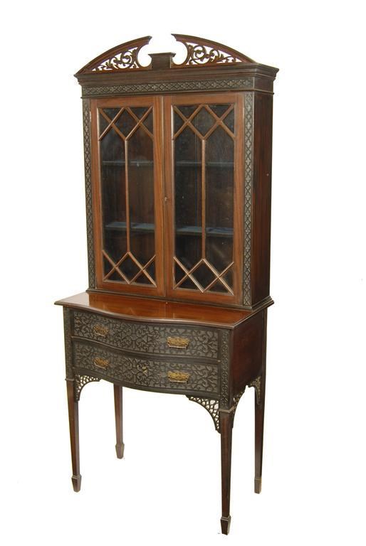 An Edwardian mahogany display cabinet on stand, with blind fret decoration, the astragal glazed doors enclosing two shelves, the base fitted two drawers, 71.5in (181.5cm) h, 30in (76cm) w, 17in (43cm) d. Section of one foot missing.