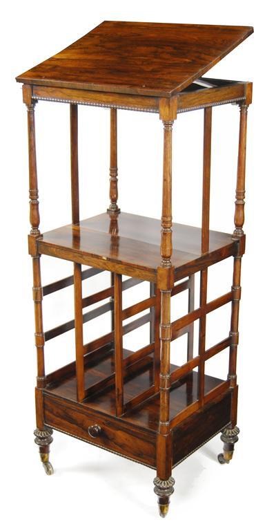 A William IV rosewood Canterbury whatnot, in the manner of Gillows, the hinged ratcheted top (rest lacking), to a nulled edge on turned column supports to a lower tier with slatted divisions above a drawer on gadrooned turned feet brass caps and castors, 48in (122cm) h, 20.25in (51.5cm) w, 16.5in (41.8cm) d. Top warped, two slats added at a later date.