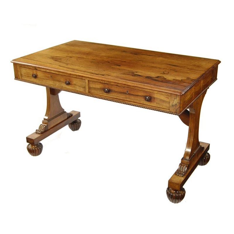 A George IV rosewood library table, the rectangular moulded edge top above two frieze part cedar lined drawers, the locks stamped 'Baron's' crowned, with dummy drawers to the reverse, on solid trestle ends united by a carved stretcher, on lobed bun feet to brass castors stamped 'C.Cope Patent', 28.5in (72cm) h, 45.75in (116cm) w, 23in (68.5cm) d. Losses to mouldings.