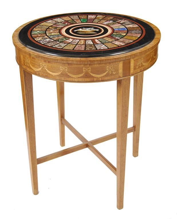 A pietra dura and micro-mosaic table top, the centre decorated with Pliny's doves encircled by two bands of specimen marble, Italian, second half 19th century, inset into a mahogany, kingwood banded and marquetry inlaid base, 28in (71cm) h, 23in (58.3cm) dia.