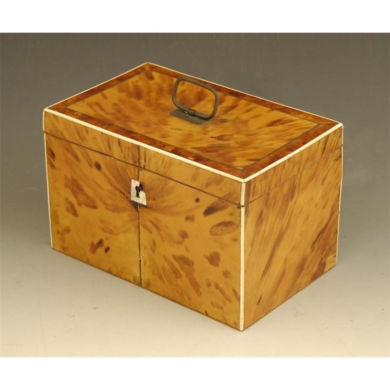 A Regency blond tortoiseshell tea caddy, with pewter stringing and ivory edging, with a mother of pearl escutcheon, damaged, the interior with replaced linings and twin covers, 5in (12.7cm) h, 7.75in (20cm) w, 5in (12.7cm) d.