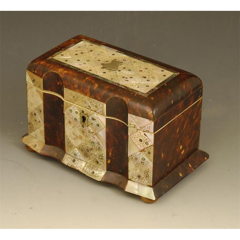 An early Victorian tortoiseshell and engraved mother of pearl panelled tea caddy, with abalone inlay and the top with an applied vacant shield, to a breakfront, the twin lidded interior with remains of foil lining on turned vegetable ivory bun feet, 5in (12.5cm) h, 8in (20.3cm) w, 4.5in (11.5cm) d. Hinges loose, some mother of pearl segments missing, minor chips, lids warped, one handle missing.