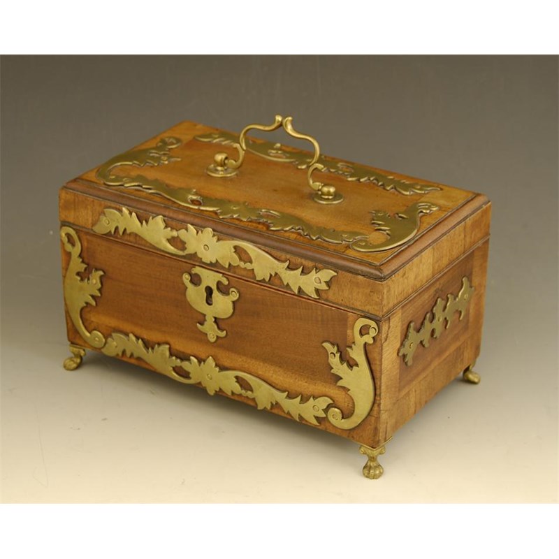 An 18th century American walnut and applied brass tea caddy, with cross banded veneers, the hinged cover with a scroll handle and the interior with embossed paper lining including an eagle on a shell with spears, with a later divided and lidded interior, on later brass paw feet, 5.5in (14cm) h, 9.75in (24.7cm) w, 5.75in (14.6cm) d.