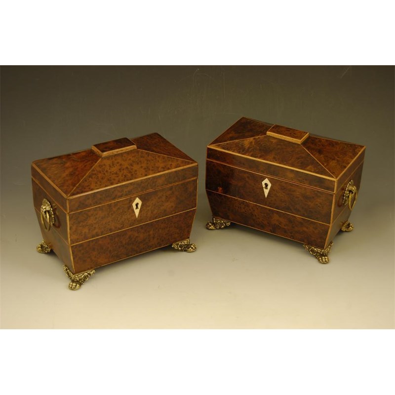 A pair of Regency burr yew veneered sarcophagus shape tea caddies, with boxwood stringing, the hinged covers revealing twin-lidded interiors, embossed basket plate ring side handles, on paw feet, 6.25in (16cm) h, 7.5in (19cm) w, 4.5in (11.5cm) d. (2) Restoration.