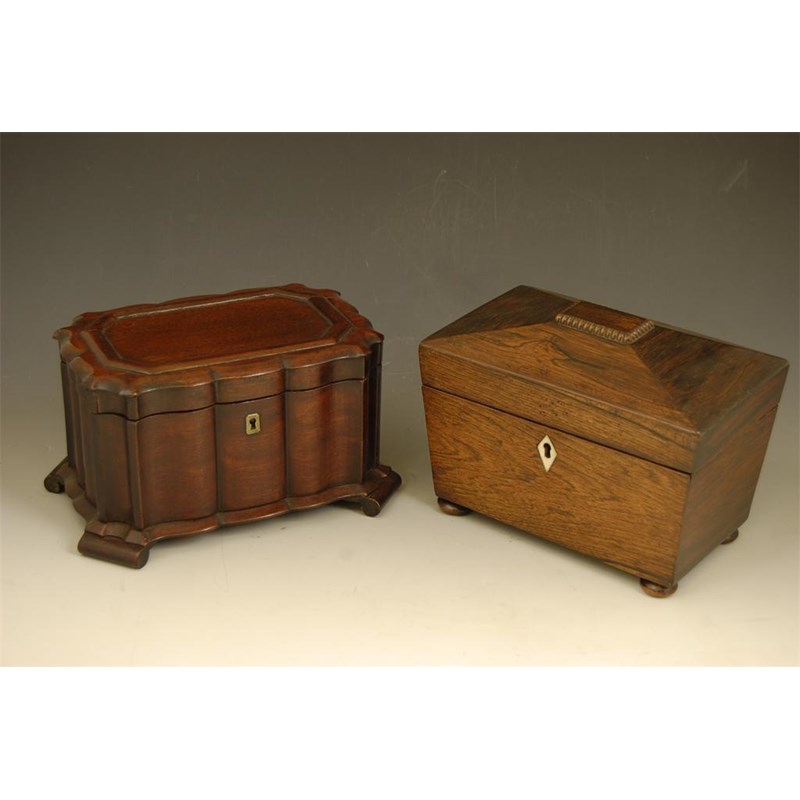 A Victorian rosewood sarcophagus shape tea caddy, with a twin lidded interior, 6in (15cm) h, and a 19th century serpentine sided box, the interior vacant, probably a tea caddy. (2)