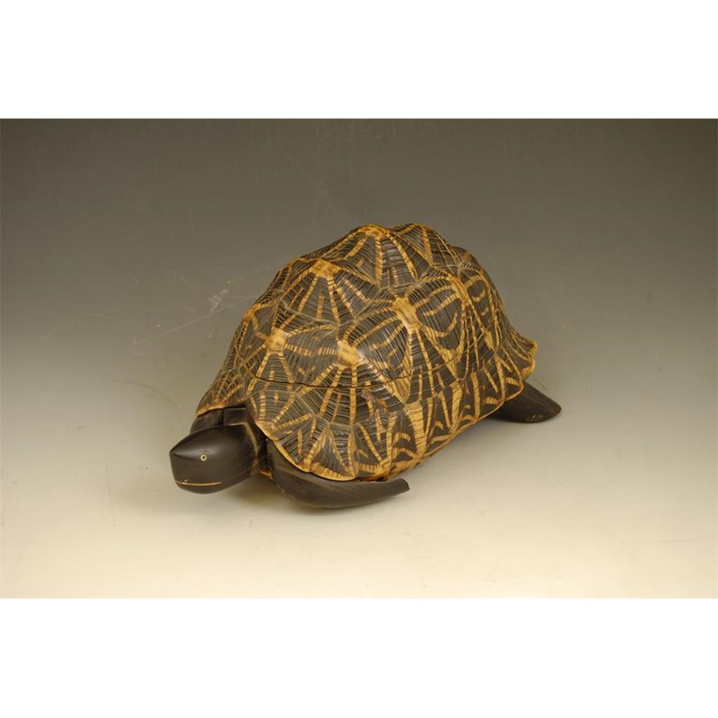 An Anglo-Indian tortoise tea caddy, modelled using the whole shell with ebony head and legs, the hinged cover with a parquetry inlaid top and a lidded compartment with a brass lock, 6in (15cm) h, 11.5in (29cm) l.
