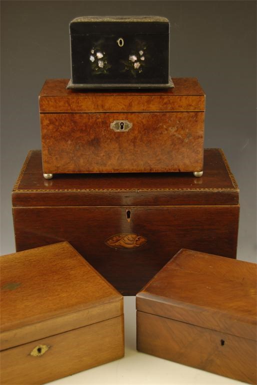 An early 19th century amboyna rectangular tea caddy, with plated mounts and ebonised edging, the interior with a pair of lidded compartments flanking a bowl recess, 5.5in (14cm) h, 10.25in (26cm) w, 5in (12.7cm) d, a Victorian papier mache and abalone inlaid tea caddy and three 19th century boxes. (5)