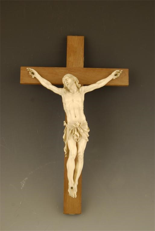 A 19th century carved ivory Corpus Christi, on a mahogany cross, 14.5in (37cm) h, 9in (22.8cm) w.