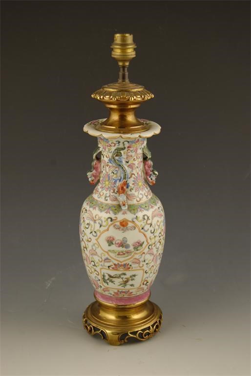 A famille rose vase table lamp, with gilt brass mounts, 16.5in (42cm) h.