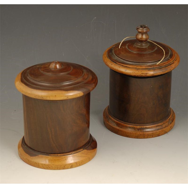 A 19th century turned lignum vitae string box, the cover with a pierced aperture and ogee shaped cutter, 7.25in (18.5cm) h, and another similar string box, with a pierced aperture to the top with a screw-off base. (2)