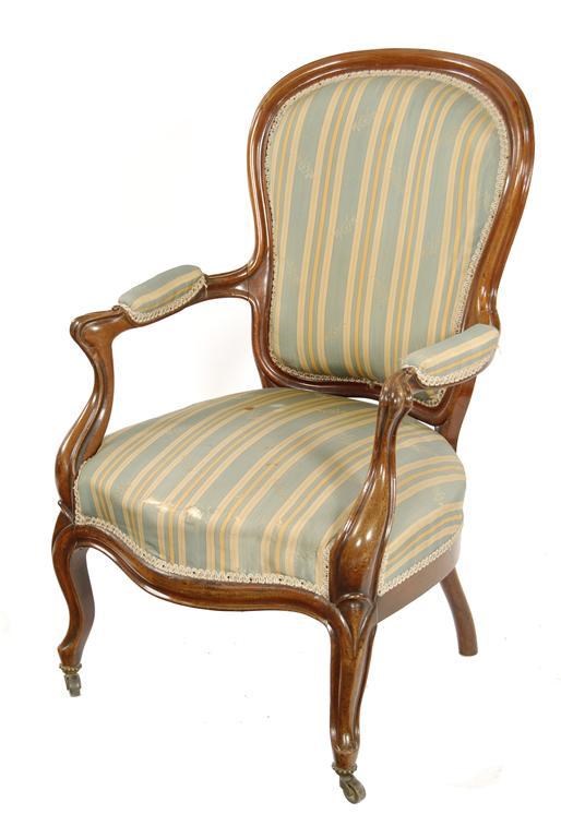 A mid 19th century mahogany easy open armchair, with padded back, armrests and serpentine front seat, the moulded show frame on cabriole legs to horn castors. Repair to right arm.