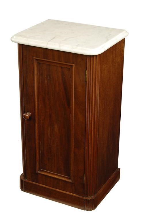 A mahogany pot cupboard, with a white marble top, 29.25in (74.2cm) h, 16in (40.5cm) w, 13in (33cm) d.