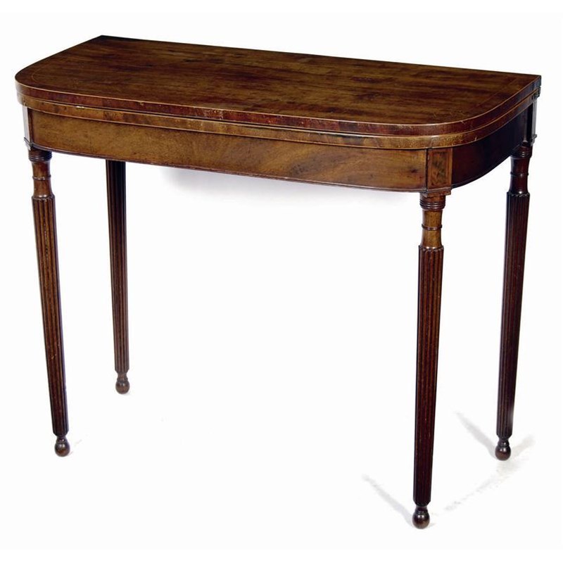 An early 19th century 'D' shape tea table, inlaid boxwood stringing, 29.75in (75.2cm) h, 35.75in (90.7cm), 17.75in (45cm) d. Restoration with replaced sections of veneer.