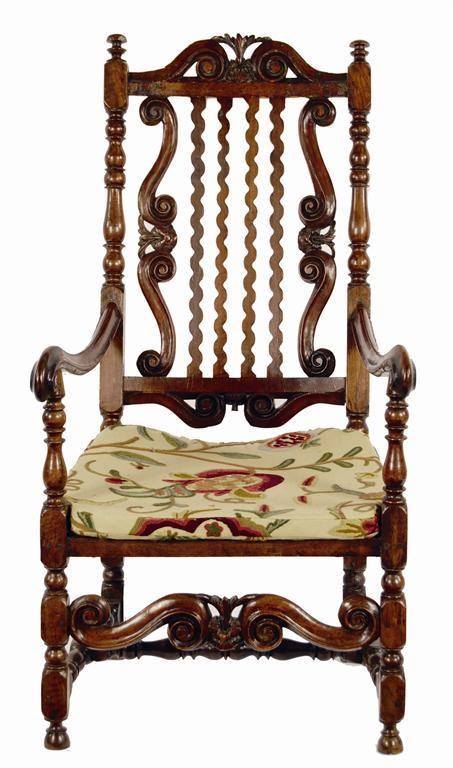 A late 17th century carved walnut open armchair, the back with wavy splats framed by scrolls and leaf carving, the turned and block supports to moulded scroll arms with conforming supports and front stretcher and a 'H' stretcher. Old restoration.