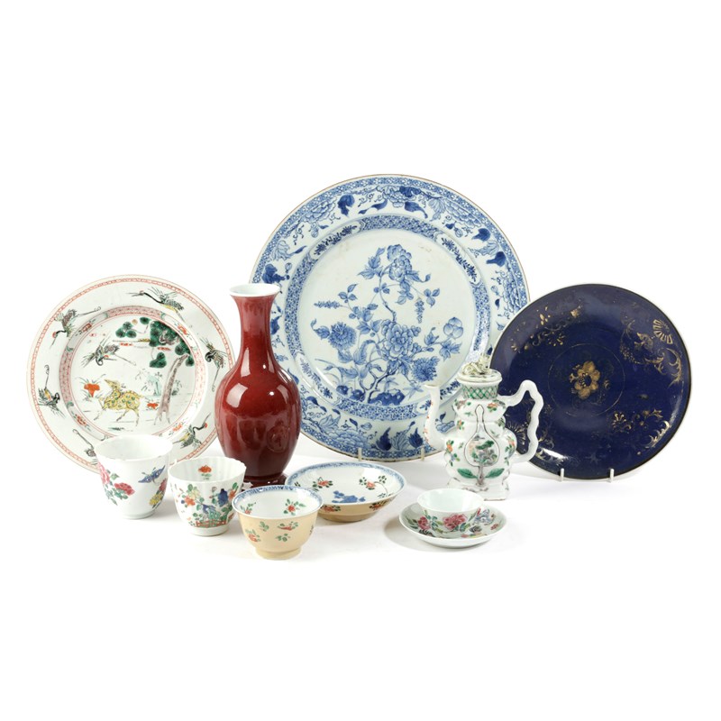comprising: a sang de boeuf vase, a famille verte wine ewer, possibly for the Islamic market, two teabowls and saucers, two further teabowls, a powder blue and gilt plate, a famille rose plate and a blue and white charger (9)