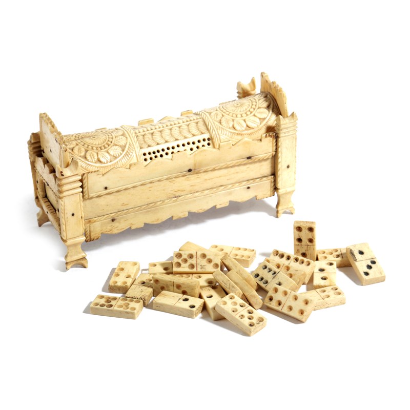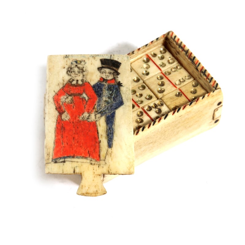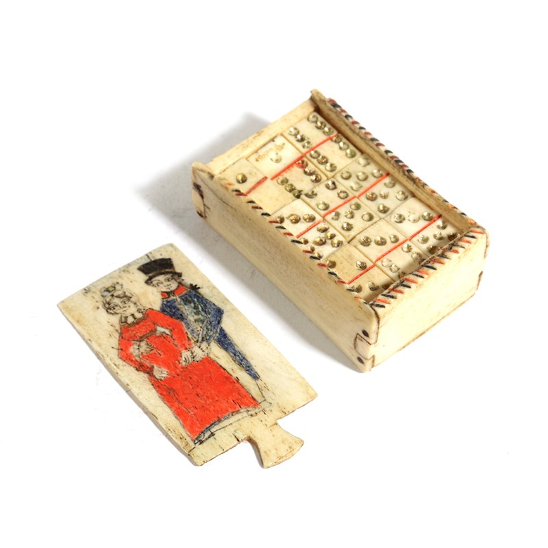 the lift-off top revealing twenty-four dominoes, together with a dominoes box, the sliding cover decorated with figures (2)