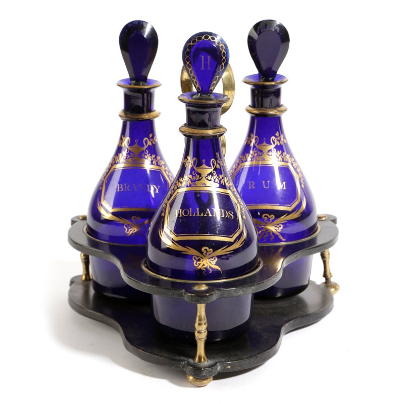 each of mallet form with a gilt label inscribed 'Brandy', 'Rum' and 'Hollands', in an ebonised and brass carrier
