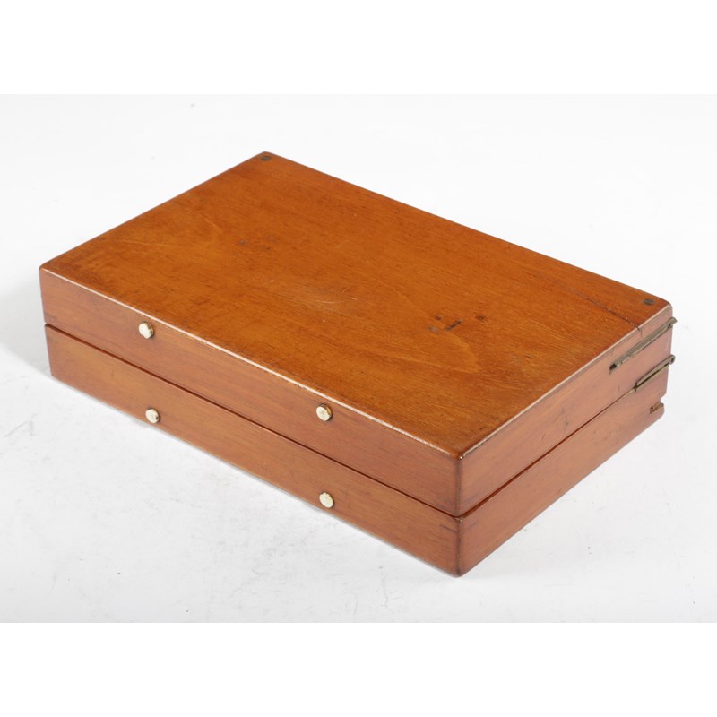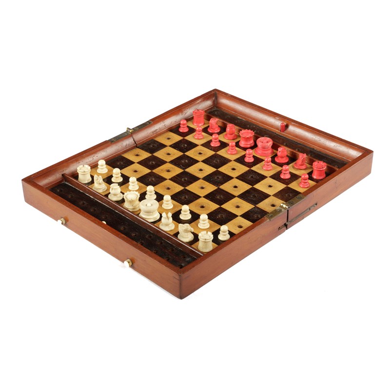 A MAHOGANY AND BONE TRAVELLING CHESS SET