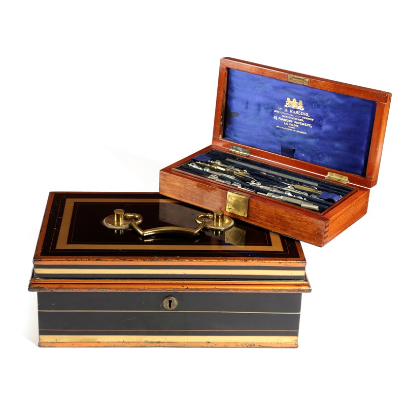 the underside of the lid with a maker's plaque 'Chubb & Sons 128 Queen Victoria St. London', together with a mathematical instrument case by W.H. Harling, the mahogany box with a brass plaque inscribed 'No.4514,W.H.Harling, London 1916', the interior with various compasses and other utensils (2)