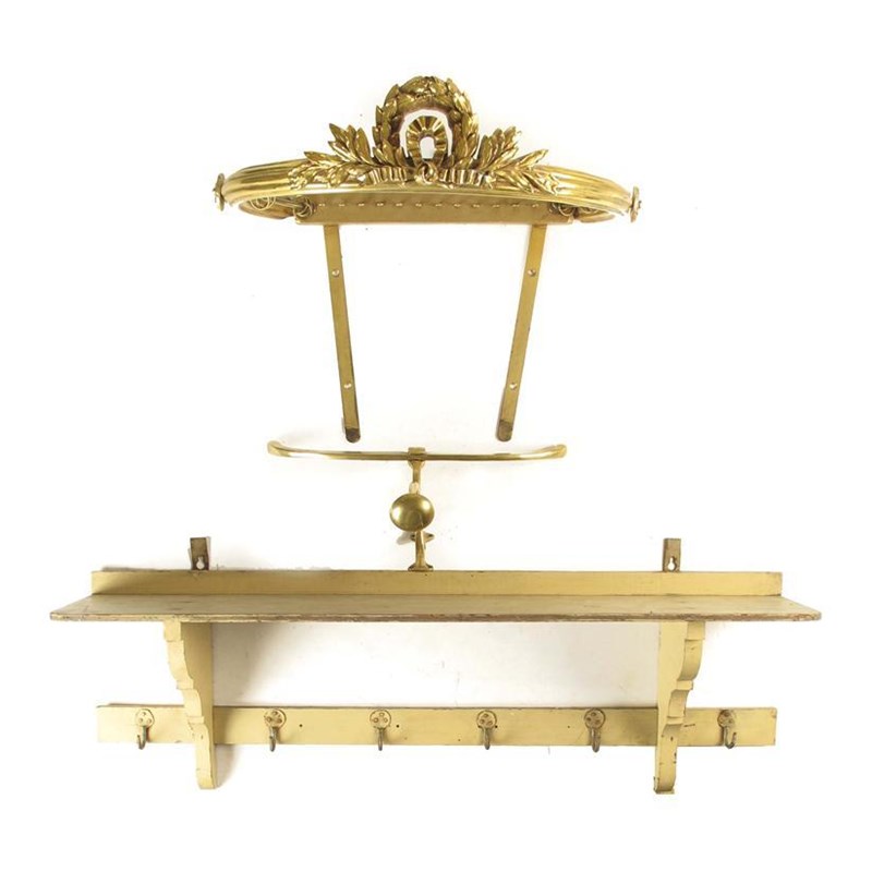 A modern gilt and brass curtain rail, of horse shoe shape with a ribbon tied laurel wreath surmount, 20in (51cm) w, a brass coat hook, 16in (40.6cm) w and a painted pine coat rack, 38.5in (97.6cm) w. (3)