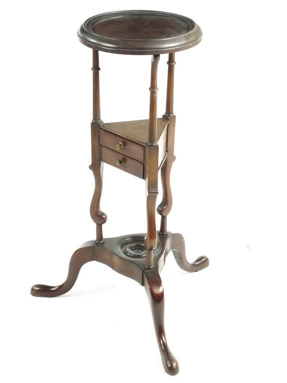 A mahogany washstand in mid 18th century style, the open ring top with a later insert on turned supports to a triform centre, fitted two drawers on cabriole legs and pad feet, 31.25in (79.5cm) h, 21in (53.4cm) w.