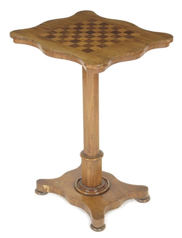 A 19th century mahogany games table, the rectangular serpentine edge top inlaid a rosewood and bird's eye maple chequer board, 29in (73.5cm) h, 20in (51cm) w, 16.75in (42.5cm) d.