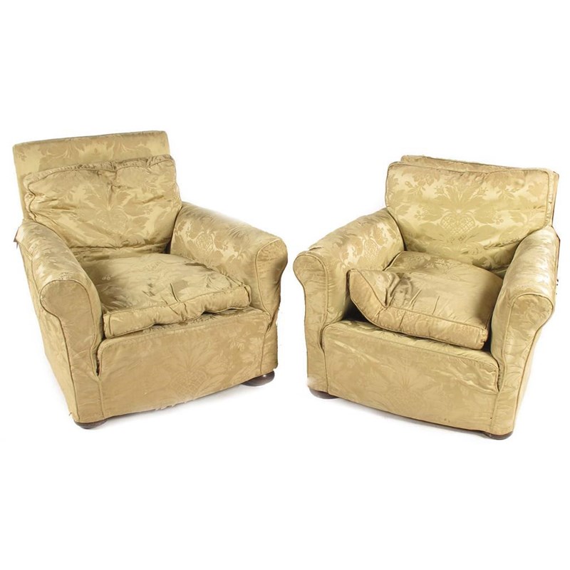 A pair of easy armchairs, with damask loose covers and turned mahogany bun feet. (2)