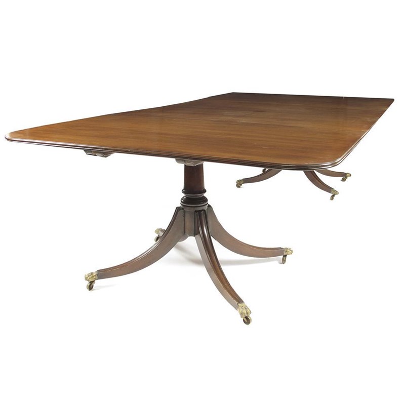 A mahogany twin pedestal dining table, having a reeded edge, with two extra leaves on a turned barrel stem with moulded splay legs, brass paw sabot and castors, 29.75in (75.5cm) h, 120in (305cm) w extended, 60in (152.5cm) d.