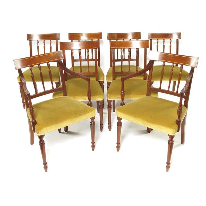 A set of eight mahogany dining chairs, in late George III style with satinwood banded bar backs above turned and carved supports, comprising a pair of open armchairs and six side chairs. (8)