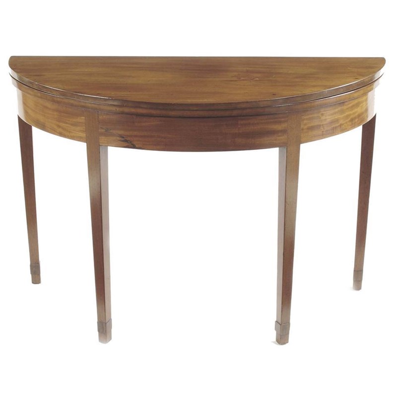 An early 19th century mahogany tea table, with demi-lune hinged top on square tapering legs with applied ankles, 27.75in (70.5cm) h, 42.25in (107.5cm) w, 18.75in (47.5cm) d.