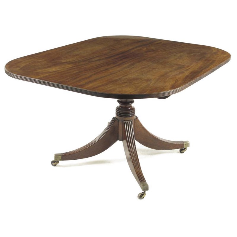A late George III mahogany breakfast table, the reeded edge rectangular tilt-top, with a long brass handle release on a ring turned baluster stem and reeded legs, 27.75in (70.5cm) h, 54 x 41.75in (137 x 106cm) dia.