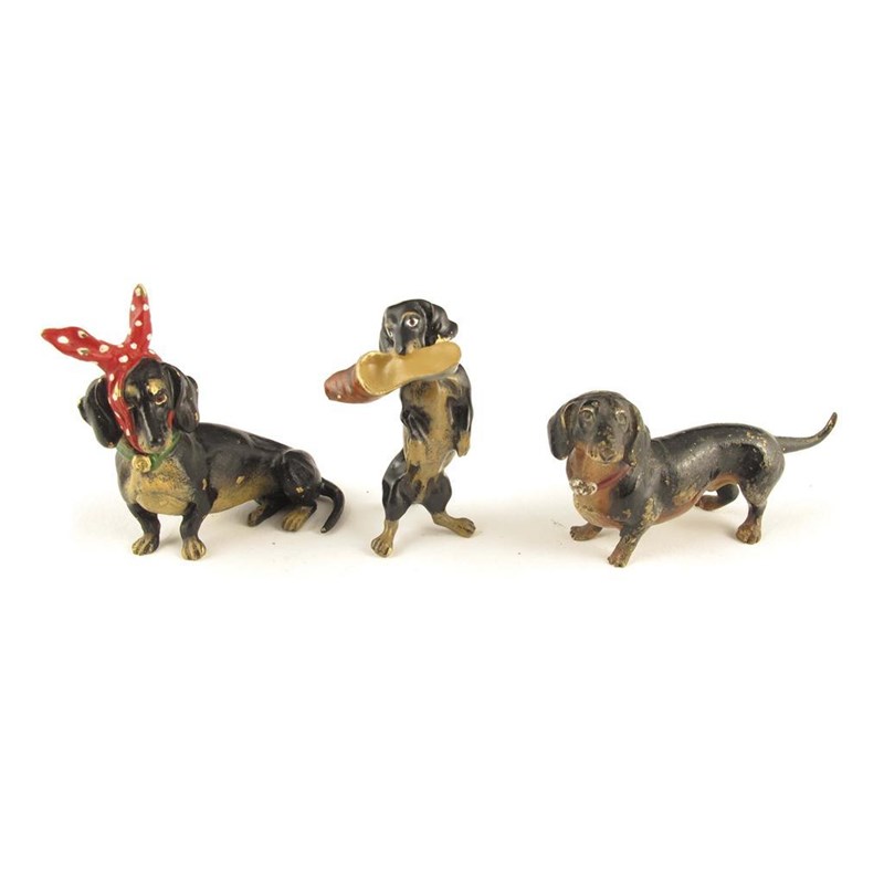 Two Fritz Bermann, Vienna, cold painted bronze Daschunds, one seated with a spotty bandage, 2in (5cm) h, the other standing on its hind legs with a slipper in its mouth, both stamped with initials, and a German cold painted bronze standing Daschund. (3)