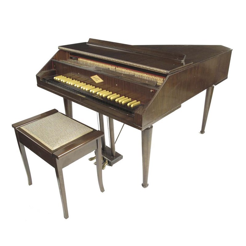 A mahogany spinet by William de Blaise, London, No.267, on turned beech legs, 35.5in (90cm) h, 56.5in (143.5cm) d, 41.75in (106cm) w., with a stool. (2)