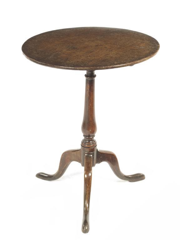 A mahogany tripod table, the circular tilt-top on a baluster stem, 18th century and later, 25.25in (64.3cm) h, 20.25in (51.5cm) dia.