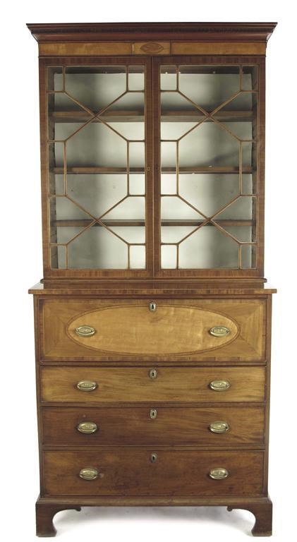 A late George III mahogany secretaire bookcase, with a fixed cornice with key moulding above a satinwood frieze with raised tablet and a pair of astragal glazed doors with boxwood edging, enclosing adjustable shelves, the secretaire fitted pigeon holes and drawers, above three further long drawers, one with division, another formerly, fitted brass oval plate handles, on bracket feet, 94.25in (239.5cm) h, 46in (117cm) w, 23in (58.5cm) d.