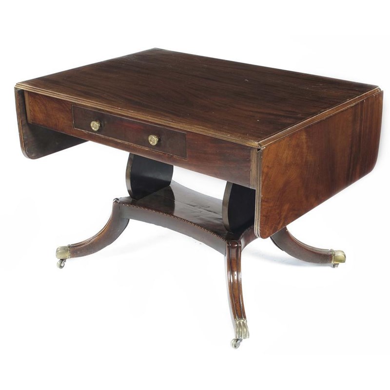 A mahogany sofa table, the reeded edge twin flap top above a frieze drawer on vase shape solid supports, moulded downswept supports and brass sabots and castors, 19th century and later, 27.5in (69.5in ) h, 27.25 x 61in (69 x 155cm) open.