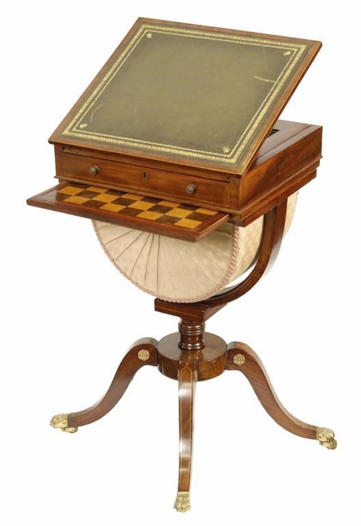 A 19th century mahogany games/writing table, inlaid stringing, with a ratchetted and slide leather inset top, revealing a backgammon board, a false drawer above a chequer board slide and a fabric covered bag, stamped '9179', on splay legs, brass paw sabots and castors, 29in (73.5cm) h, 19in (48cm) w and d.