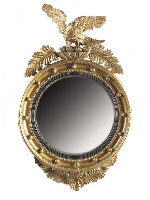 A Regency style giltwood convex wall mirror, the circular plate to a ball applied moulded frame with an eagle surmount and a leafage face, 31.5in (79.8cm) h, 19in (48cm) w.