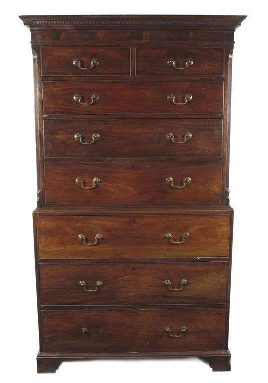 A George III mahogany secretaire chest on chest, the top half with canted fluted angles, the base with a secretaire drawer fitted a central mirrored door with serpentine outline, flanked by pigeon holes and drawers, the replaced brass lock stamped 'GR Crowned PATENT', fitted replaced brass swan neck handles,on slightly reduced, bracket feet, 75.5in (192cm) h, 44.5in (113cm) w, 21.75in (55.5cm) d.