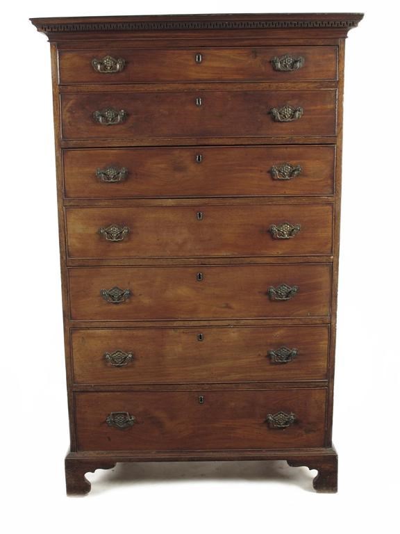 A George III Irish mahogany chest, the Greek key cornice above seven graduated drawers, fitted later brass plate handles on bracket feet, 63.5in (161.1cm) h, 40.25in (102cm) w, 21.25in (54cm) d.
