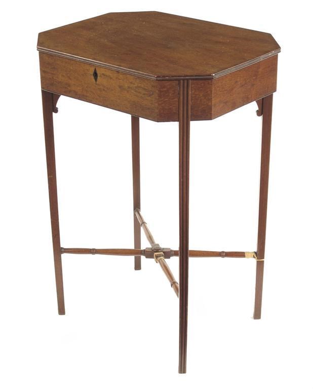 An early 19th century mahogany work table, the canted corner hinged top above a partly divided interior, on reeded supports united by a turned 'X' stretcher, 28.25in (72cm) h, 20in (51cm) w, 15.75in (40cm) d.