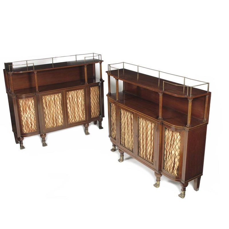 A pair of mahogany breakfront dwarf cabinets in Regency style, with a brass gallery rail top above a colonnaded tier, to boxwood edging above a pair of fabric backed grille doors and similar sides enclosing a shelf, the turned legs on brass claw sabots, modern, 39.5in (100.5cm) h, 47in (119.5cm) w, 12in (30.5cm) d. (2)