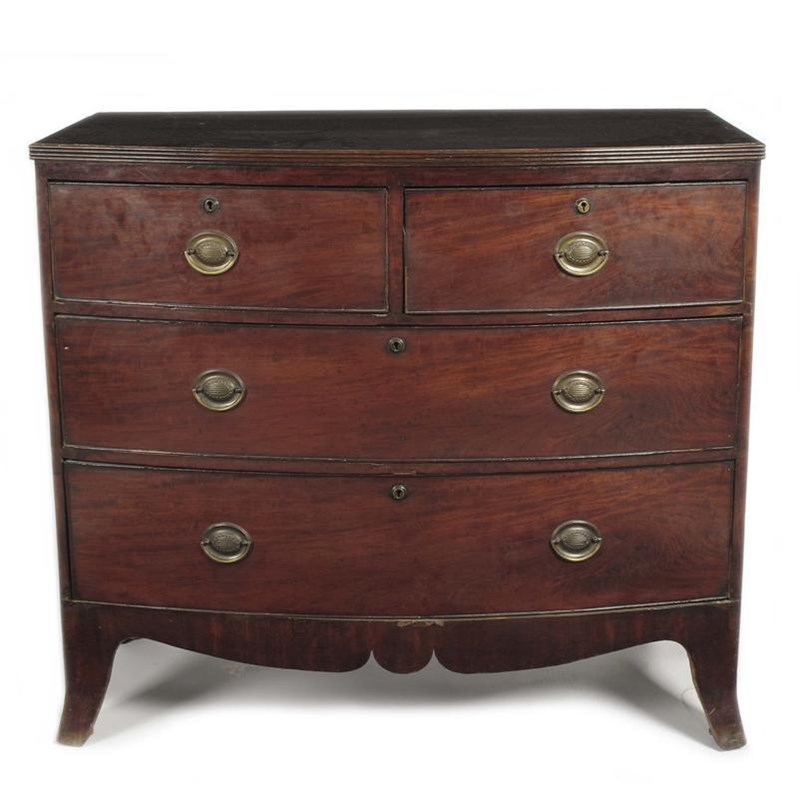 An early 19th century mahogany bowfront chest, with two short and two long graduated oak lined drawers, fitted later brass oval plate handles, 36.5in (93cm) h, 42.5in (108cm) w, 21in (53.5cm) d.