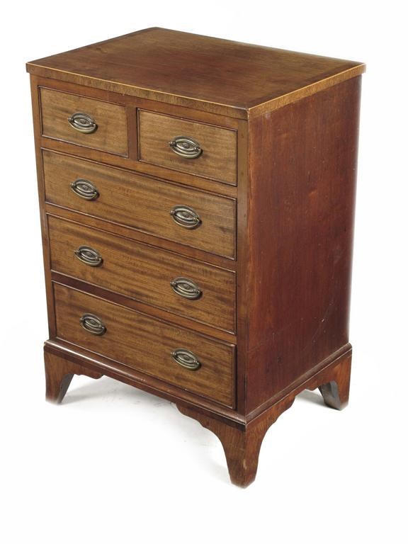 A small mahogany chest, the crossbanded top above two short and three long graduated drawers on bracket feet, 29in (73.8cm) h, 21in (53cm) w, 15in (38cm) d.