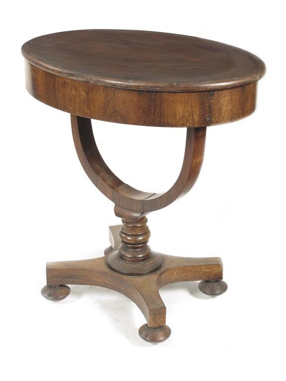 A William IV rosewood work table base, with a later loose top, 29.5in (75cm) h, 26.75in (67.8cm) w, 28.75in (47.8cm) d.