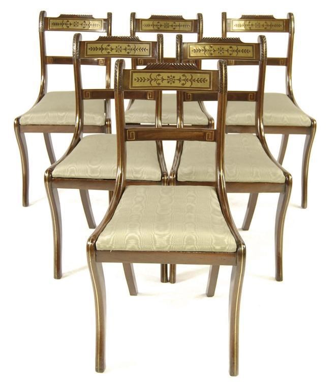 A set of six Regency mahogany and brass inlaid dining chairs, each with a curved top rail with a floral marquetry tablet, with stiff leaf carved uprights, the drop-in seat on sabre legs. (6) Restoration, repairs and replacements.