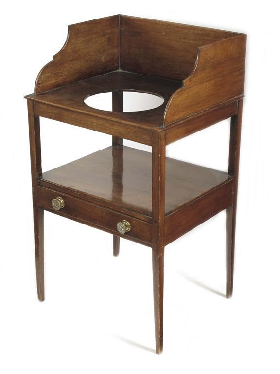 A late George III mahogany washstand, the galleried top to a bowl aperture, the base fitted a drawer on square tapering legs, 37.5in (95.2cm) h, 21.5in (54.5cm) w, 18.5in (47cm) d.
